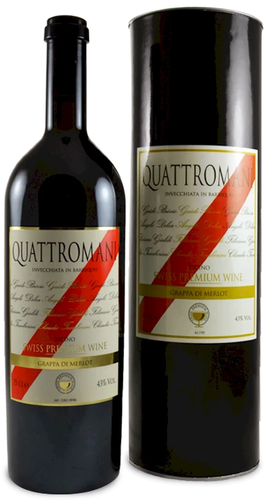Der Grappa Quattromani ist ein eleganter, raffinierter und ganz besonderer Grappa. Es ist der einzige Grappa der Welt, der in Symbiose von vier befreundeten Winzern produziert wurde: Guido Brivio aus dem Mendrisiotto, Claudio Tamborini vom Luganese, Angelo Delea aus Locarno und Feliciano Gialdi von Tre Valli. Der sorgfältig ausgewählte Merlot Trester destilliert langsam, um den besten Teil, das Herz, in der Brennerei Delea in Losone zu extrahieren. Der Grappa wird in Barriques von hochwertiger französischer Eiche während 8 Jahren gereift.