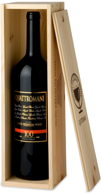 Quattromani: Angelo, Claudio, Feliciano und Guido haben haben die besten Merlots des Jahrganges 2015 aus den Weinbergen um Mendrisio, Lugano, Locarno und den Tre Valli ausgewählt, um einen hervorragenden Tropfen zu schaffen, der die Exzellenz des Tessiner Terroir verkörpert. Der QUATTROMANI wurde in Eichenfässern ausgebaut und in 30000 Flaschen und 2400 Mangnum, 240 Jeroboam (3 lt.) und 16 Salamanazar (9 lt.) abgefüllt."